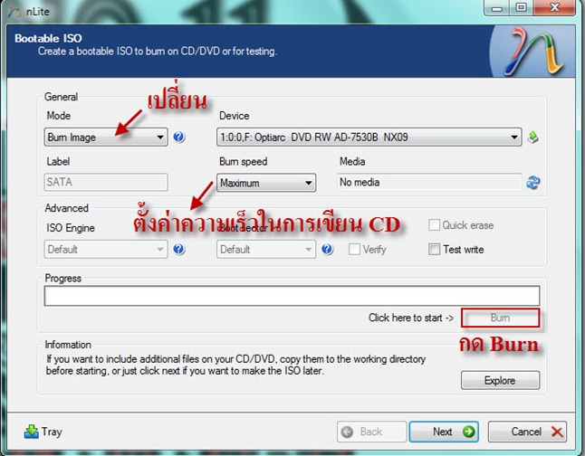 หลังจากทำการสร้างไฟล์เสร็จแล้วให้คุณเปลี่ยน Mode ตามรูปเพื่อทำการเขียนลงบนแผ่น CD ขั้นตอนดังรูป เสร็จจากการBurn เป็นที่เรียบร้อยให้กดปุ่ม Next